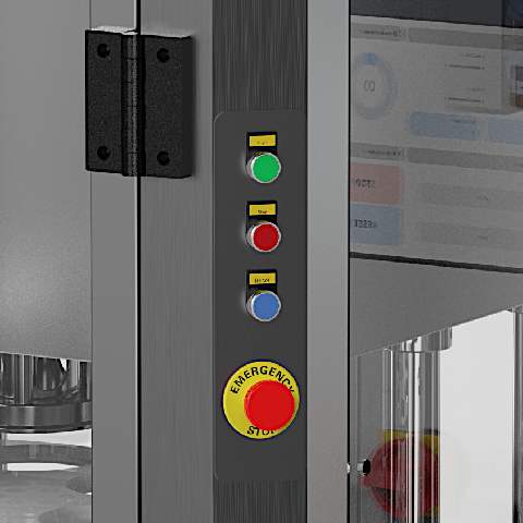 The machine is supplied with one complete diameter set. In addition, there is separate speed control for the infeed and outfeed conveyor belt, which contributes to the efficiency of the process, if the outfeed conveyor is full, the machine will no longer accept composite cans for closing. If the outfeed conveyor is empty, the machine will automatically pick up its program again and continue closing.
